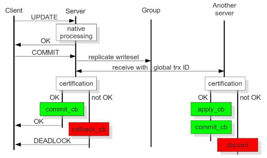 갈레라 클러스터에서 이를 virtually synchronous replication 라고 부릅니다.