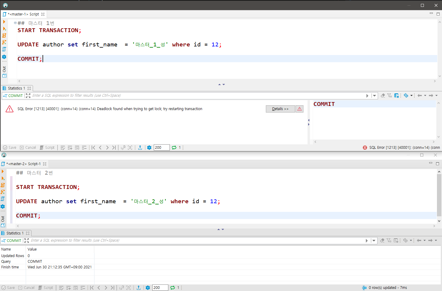 이와 같은 상황을 막기위해 1번에서는 데드락이 발생하게되고, 마스터 1의 write-set은 무시됩니다.