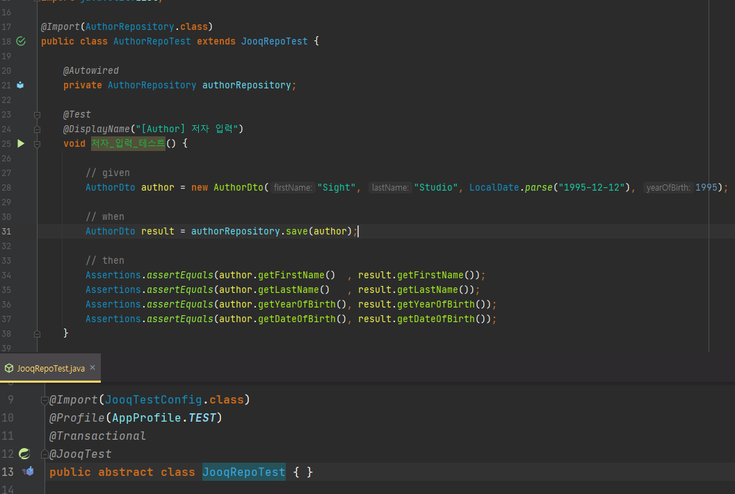 아래의 사진과 같이 JooqRepoTest를 만들어 상속받는 구조로 테스트코드를 작성하면 됩니다.