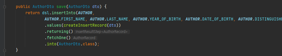 jOOQ에서는 다음과 같이 **returning()**을 사용해서 입력한 값을 다시 받을 수 있습니다.