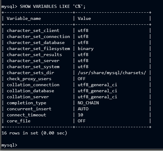 SHOW VARIABLES LIKE ‘C%’; # 인코딩 설정 확인
