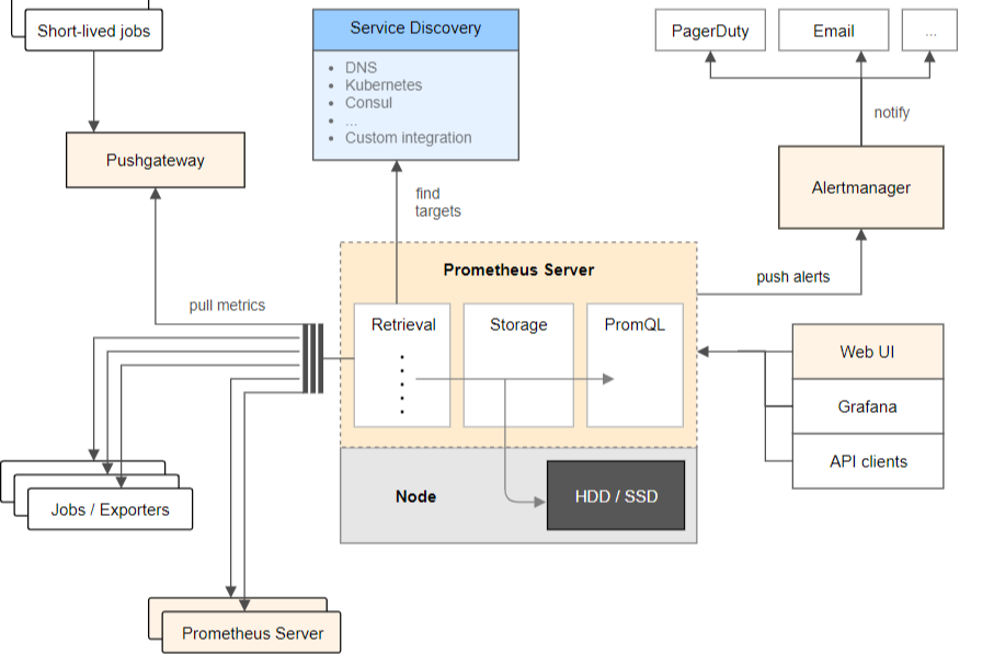 Retrieval을 통해 각 Exporter들을 Pulling 하는 방식입니다. 즉 전자보다 트래픽의 부담이 덜합니다.