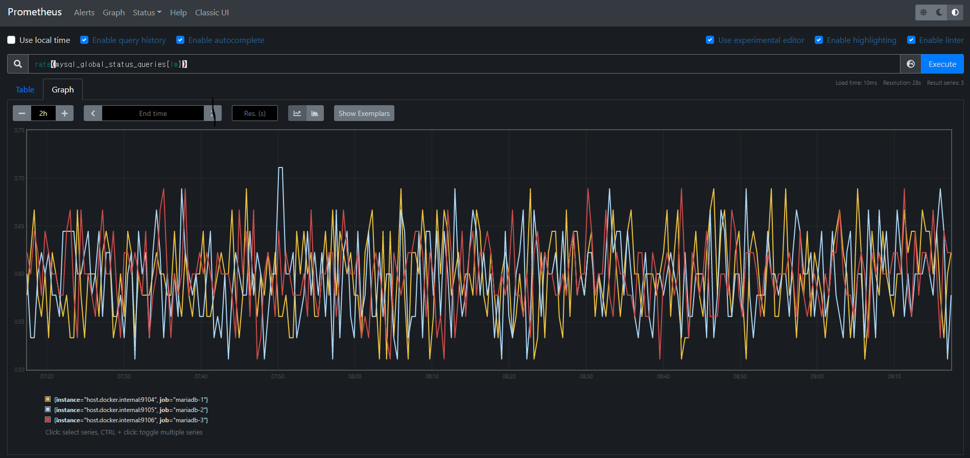 아래사진은 PromQL로 MariaDB에 분당 쿼리 처리량을 프로메테우스 WebUI 에서 질의한 형태입니다.