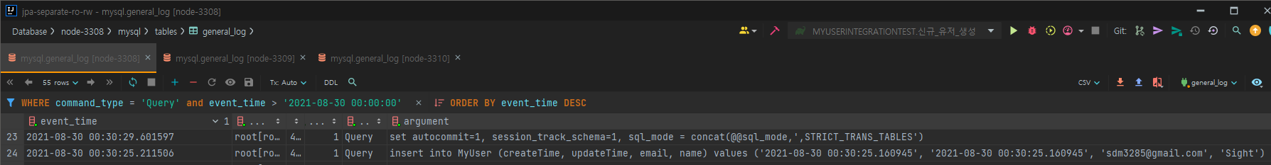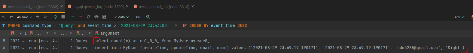 실제 쿼리 로그를 보면 insert, select 모두 RW 노드에서 실행된 것을 확인 할 수 있습니다.