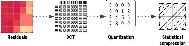압축 과정은 아래와 같으며, 이 방식은 JPEG와 유사합니다.